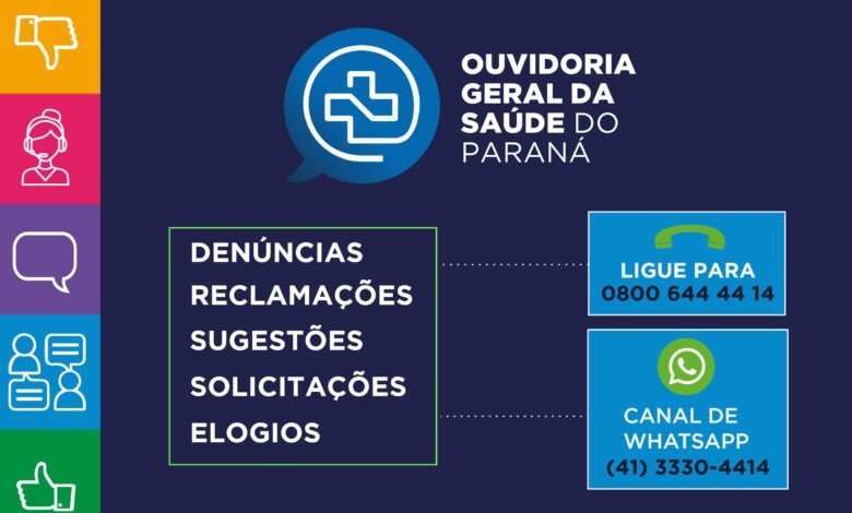 Com uma média de 67 mil atendimentos por ano, o site oficial da Secretaria de Estado da Saúde (Sesa), os telefones 0800 644 44 14 e telefone exclusivo do WhatsApp (41) 3330-4414 são canais para sugestões, solicitações, reclamações, denúncias, elogios e demais informações quanto aos serviços e atendimentos prestados na saúde paranaense.